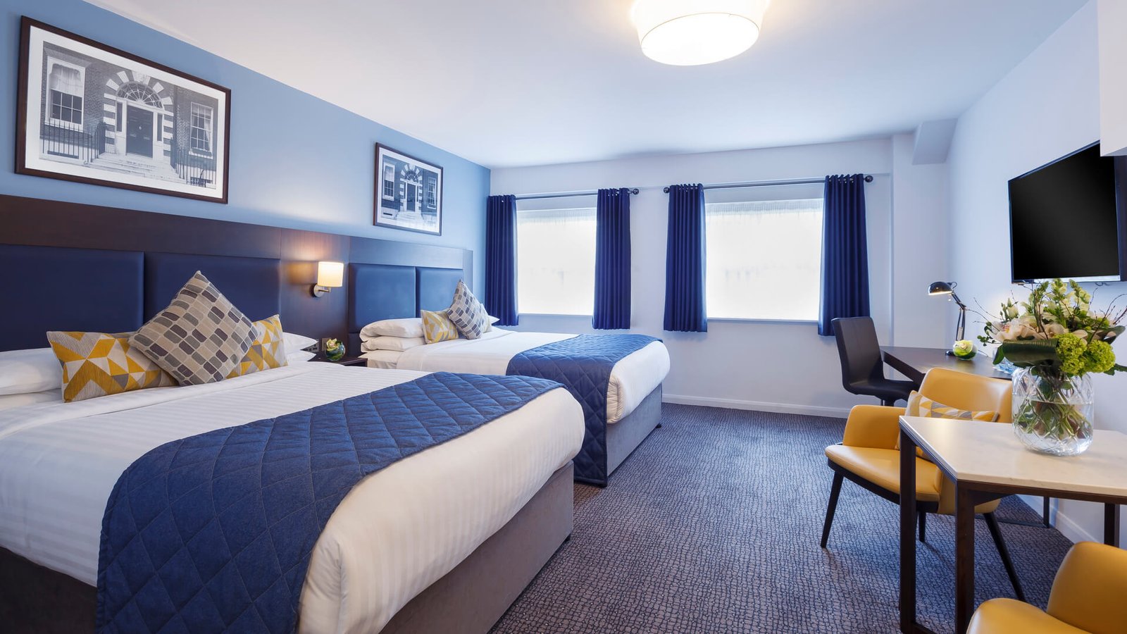 A quadruple room means that up to 4 guests can be accommodated in that room. Depending on your needs if it is suitable. The type of bedding that this hotel has for the quadruple is 2 double beds. Double beds are just 6 inches smaller in width than a queen.